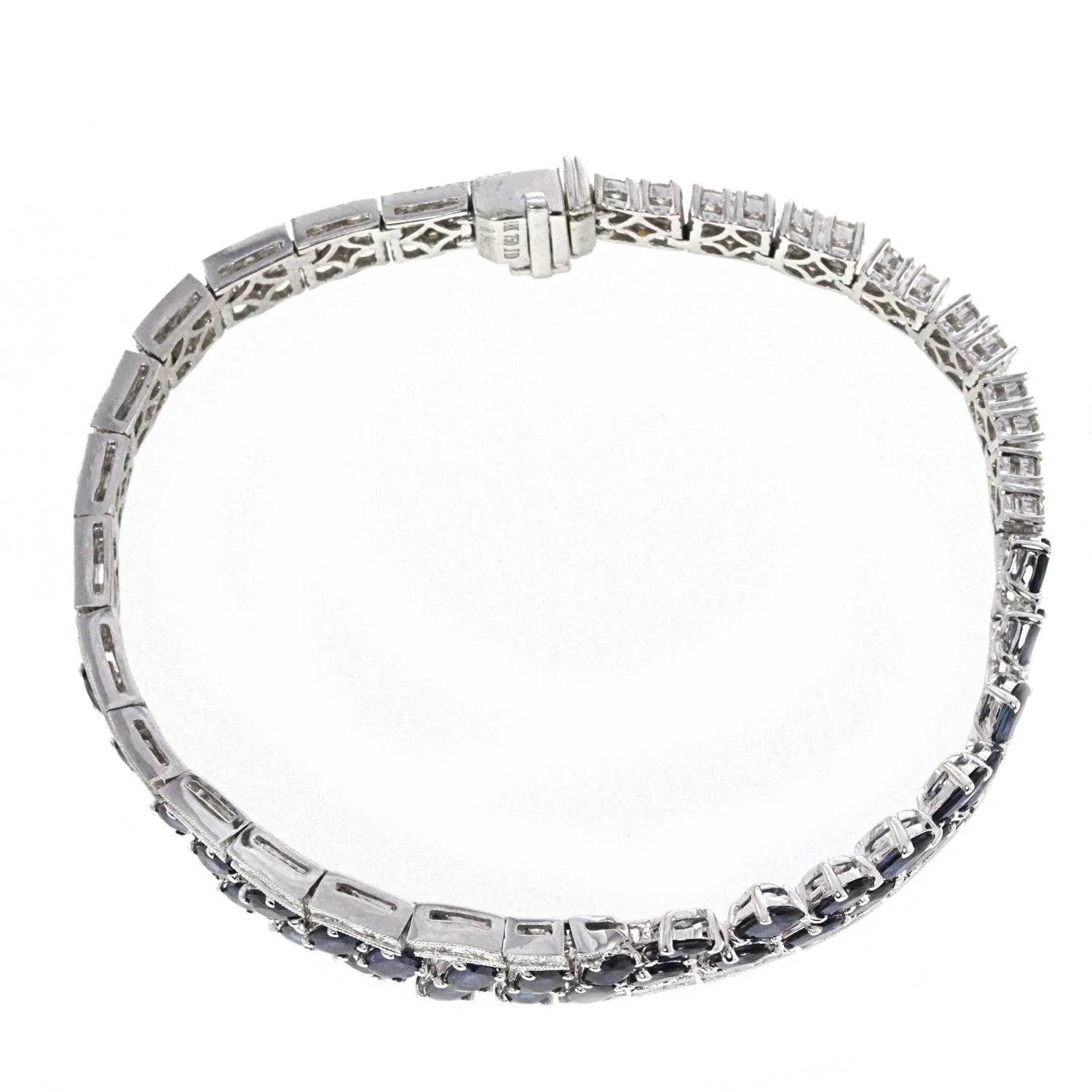 Ladies Diamond and Sapphire Bracelet. 18k White Gold set with brilliant round cut diamonds in a pave setting, with blue sapphires in a prong setting. Diamond carat weight 5.45CT, and sapphire carat weight is 8.94CT. Bracelet weighs 26.68 grams.